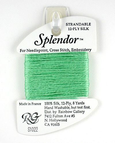 This is Splendor from Rainbow Gallery in color 1022 Green Blush. A soft stranded silk from Rainbow Gallery. Use 6 strands on 13 mesh, 3 or 4 strands on 18 mesh.