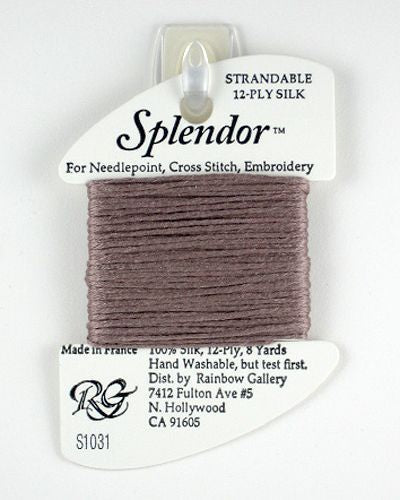 This is Splendor from Rainbow Gallery in color 1031 Lite Sandalwood. A soft stranded silk from Rainbow Gallery. Use 6 strands on 13 mesh, 3 or 4 strands on 18 mesh.