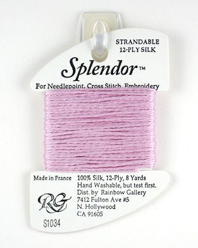 This is Splendor from Rainbow Gallery in color 1034 Lite Plum. A soft stranded silk from Rainbow Gallery. Use 6 strands on 13 mesh, 3 or 4 strands on 18 mesh.