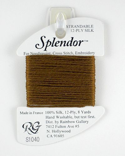 This is Splendor from Rainbow Gallery in color 1040 Ginger. A soft stranded silk from Rainbow Gallery. Use 6 strands on 13 mesh, 3 or 4 strands on 18 mesh.