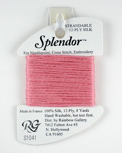 This is Splendor from Rainbow Gallery in color 1041 English Rose. A soft stranded silk from Rainbow Gallery. Use 6 strands on 13 mesh, 3 or 4 strands on 18 mesh.