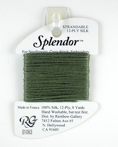 This is Splendor from Rainbow Gallery in color 1063 Fern Green. A soft stranded silk from Rainbow Gallery. Use 6 strands on 13 mesh, 3 or 4 strands on 18 mesh.