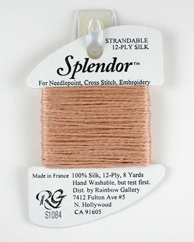 This is Splendor from Rainbow Gallery in color 1084 Honey Bronze. A soft stranded silk from Rainbow Gallery. Use 6 strands on 13 mesh, 3 or 4 strands on 18 mesh.