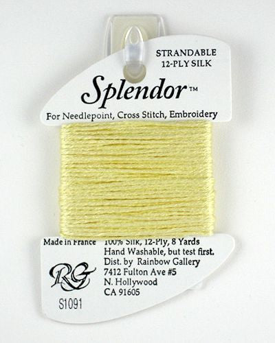 This is Splendor from Rainbow Gallery in color 1091 Chamomile. A soft stranded silk from Rainbow Gallery. Use 6 strands on 13 mesh, 3 or 4 strands on 18 mesh.