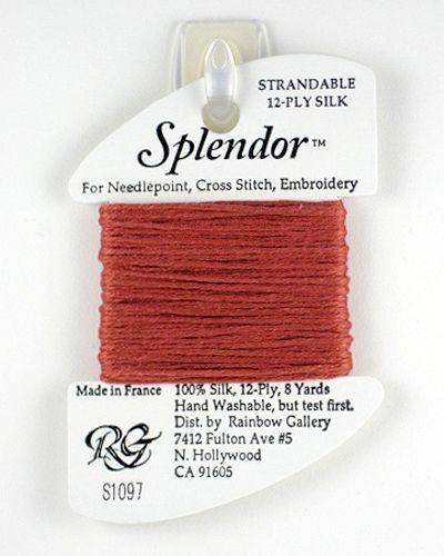 This is Splendor from Rainbow Gallery in color 1097 Dark Peony. A soft stranded silk from Rainbow Gallery. Use 6 strands on 13 mesh, 3 or 4 strands on 18 mesh.
