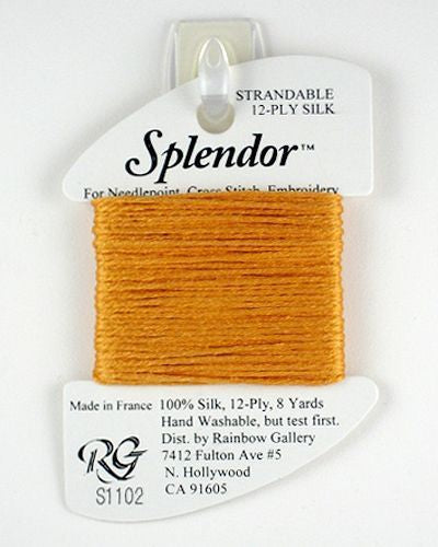 This is Splendor from Rainbow Gallery in color 1102 Apricot. A soft stranded silk from Rainbow Gallery. Use 6 strands on 13 mesh, 3 or 4 strands on 18 mesh.