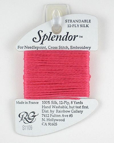 This is Splendor from Rainbow Gallery in color 1109 Brite Coral. A soft stranded silk from Rainbow Gallery. Use 6 strands on 13 mesh, 3 or 4 strands on 18 mesh.