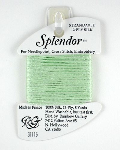 This is Splendor from Rainbow Gallery in color 1115 Pale Pistachio. A soft stranded silk from Rainbow Gallery. Use 6 strands on 13 mesh, 3 or 4 strands on 18 mesh.