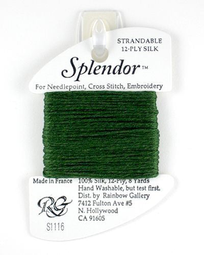 This is Splendor from Rainbow Gallery in color 1116 Victorian Green. A soft stranded silk from Rainbow Gallery. Use 6 strands on 13 mesh, 3 or 4 strands on 18 mesh.