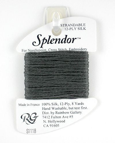 This is Splendor from Rainbow Gallery in color 1118 Slate. A soft stranded silk from Rainbow Gallery. Use 6 strands on 13 mesh, 3 or 4 strands on 18 mesh.