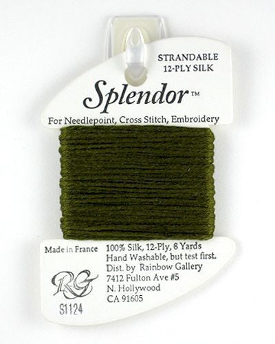 This is Splendor from Rainbow Gallery in color 1124 Very Dark Olive. A soft stranded silk from Rainbow Gallery. Use 6 strands on 13 mesh, 3 or 4 strands on 18 mesh.