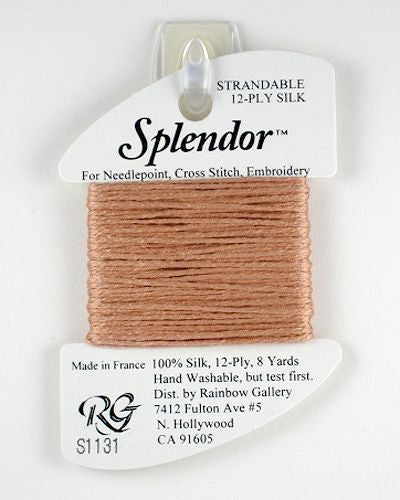 This is Splendor from Rainbow Gallery in color 1131 Tawny Bronze. A soft stranded silk from Rainbow Gallery. Use 6 strands on 13 mesh, 3 or 4 strands on 18 mesh.