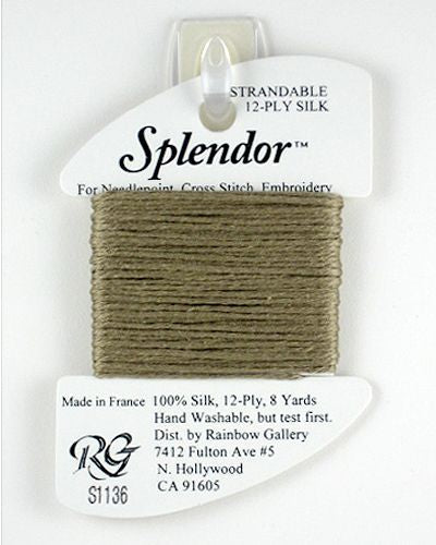 This is Splendor from Rainbow Gallery in color 1136 Mocha. A soft stranded silk from Rainbow Gallery. Use 6 strands on 13 mesh, 3 or 4 strands on 18 mesh.