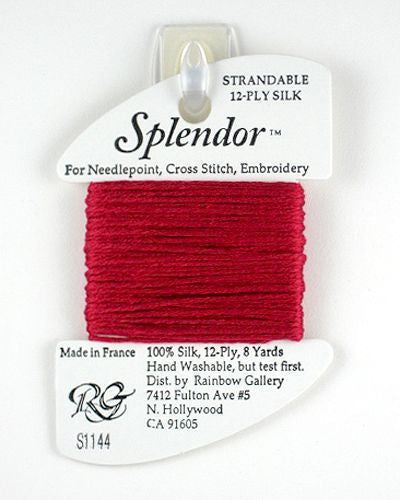 This is Splendor from Rainbow Gallery in color 1144 Very Deep Rose Pink. A soft stranded silk from Rainbow Gallery. Use 6 strands on 13 mesh, 3 or 4 strands on 18 mesh.