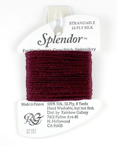 This is Splendor from Rainbow Gallery in color 1151 Very Dark Raspberry. A soft stranded silk from Rainbow Gallery. Use 6 strands on 13 mesh, 3 or 4 strands on 18 mesh.