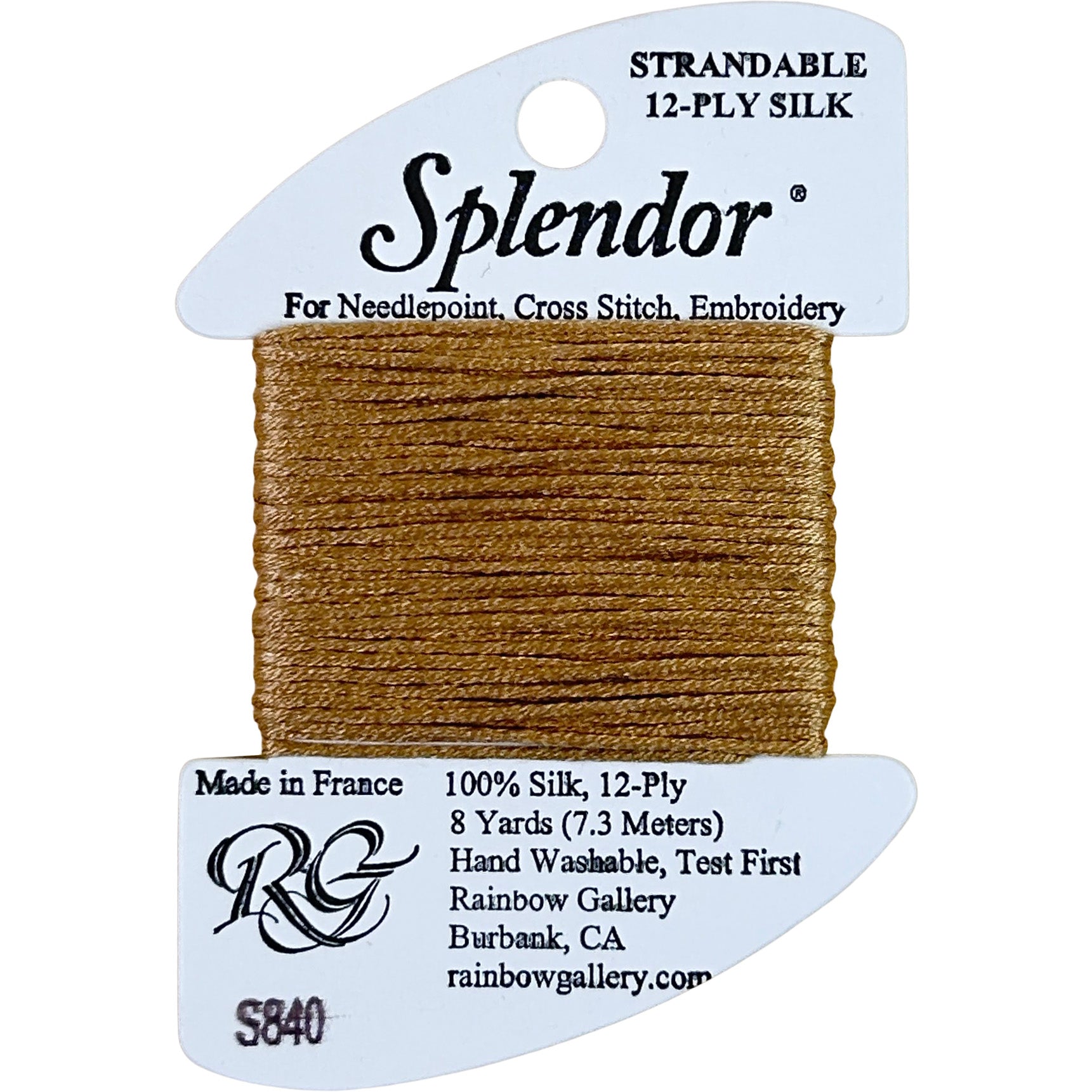 This is Splendor from Rainbow Gallery in color 0840 Camel. A soft stranded silk from Rainbow Gallery. Use 6 strands on 13 mesh, 3 or 4 strands on 18 mesh.