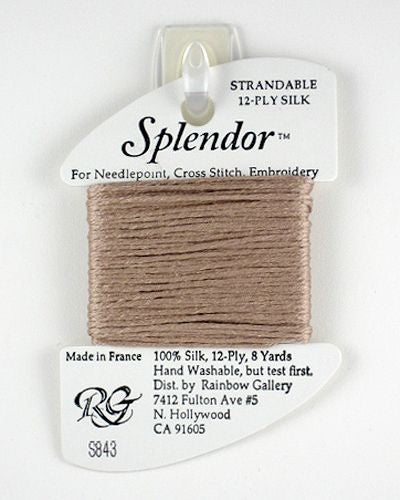 This is Splendor from Rainbow Gallery in color 0843 Fawn. A soft stranded silk from Rainbow Gallery. Use 6 strands on 13 mesh, 3 or 4 strands on 18 mesh.