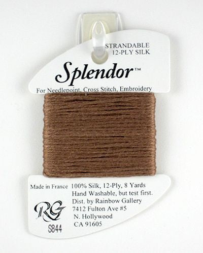 This is Splendor from Rainbow Gallery in color 0844 Dark Fawn. A soft stranded silk from Rainbow Gallery. Use 6 strands on 13 mesh, 3 or 4 strands on 18 mesh.