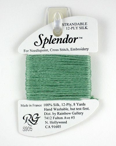 This is Splendor from Rainbow Gallery in color 0905 Light Pistachio. A soft stranded silk from Rainbow Gallery. Use 6 strands on 13 mesh, 3 or 4 strands on 18 mesh.