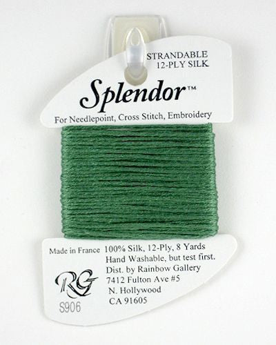 This is Splendor from Rainbow Gallery in color 0906 Medium Pistachio. A soft stranded silk from Rainbow Gallery. Use 6 strands on 13 mesh, 3 or 4 strands on 18 mesh.