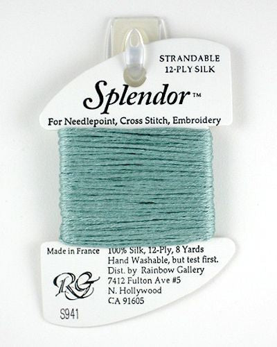 This is Splendor from Rainbow Gallery in color 0941 Medium Sea Green. A soft stranded silk from Rainbow Gallery. Use 6 strands on 13 mesh, 3 or 4 strands on 18 mesh.