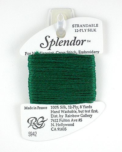 This is Splendor from Rainbow Gallery in color 0942 Spruce Green. A soft stranded silk from Rainbow Gallery. Use 6 strands on 13 mesh, 3 or 4 strands on 18 mesh.