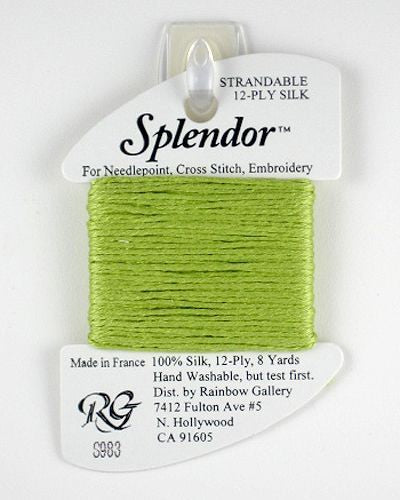 This is Splendor from Rainbow Gallery in color 0983 Pale Olive. A soft stranded silk from Rainbow Gallery. Use 6 strands on 13 mesh, 3 or 4 strands on 18 mesh.