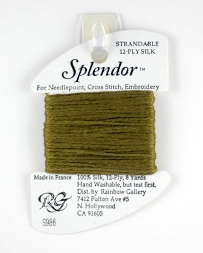 This is Splendor from Rainbow Gallery in color 0986 Dark Khaki. A soft stranded silk from Rainbow Gallery. Use 6 strands on 13 mesh, 3 or 4 strands on 18 mesh.
