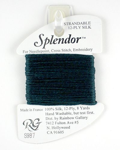 This is Splendor from Rainbow Gallery in color 0987 Very Dark Gray Green. A soft stranded silk from Rainbow Gallery. Use 6 strands on 13 mesh, 3 or 4 strands on 18 mesh.