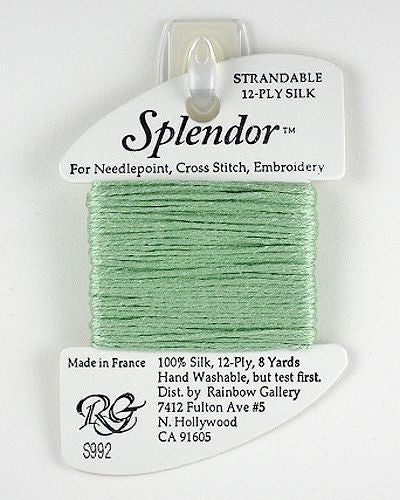 This is Splendor from Rainbow Gallery in color 0992 Pale Sea Green. A soft stranded silk from Rainbow Gallery. Use 6 strands on 13 mesh, 3 or 4 strands on 18 mesh.