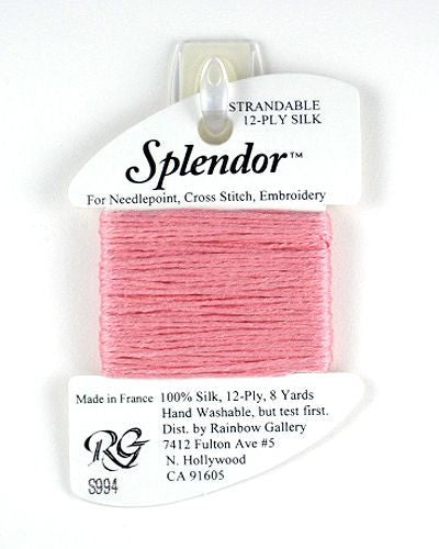 This is Splendor from Rainbow Gallery in color 0994 Pale Coral. A soft stranded silk from Rainbow Gallery. Use 6 strands on 13 mesh, 3 or 4 strands on 18 mesh.