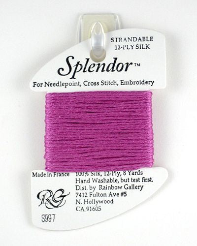 This is Splendor from Rainbow Gallery in color 0997 Orchid. A soft stranded silk from Rainbow Gallery. Use 6 strands on 13 mesh, 3 or 4 strands on 18 mesh.