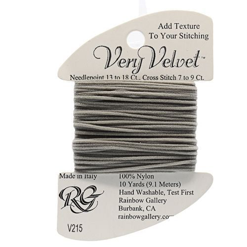 This is Very Velvet from Rainbow Gallery in color 215 Light Gray. A velvet thread perfect for stitching gloves, scarves, and other textures! Use as-is on 13 mesh