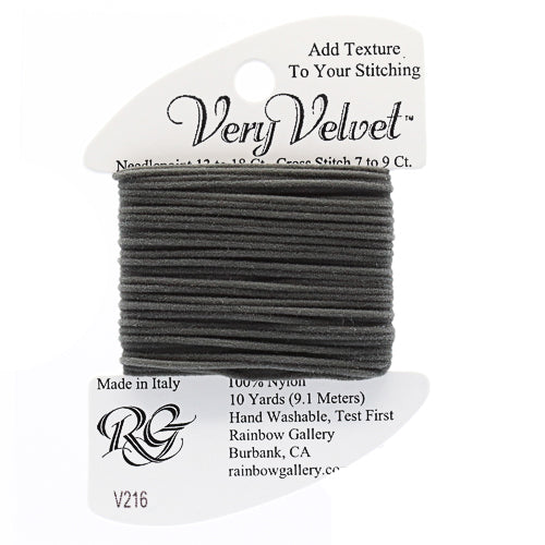 This is Very Velvet from Rainbow Gallery in color 216 Dark Gray. A velvet thread perfect for stitching gloves, scarves, and other textures! Use as-is on 13 mesh