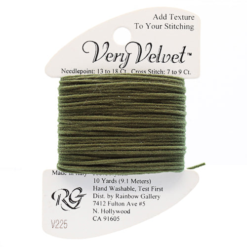 This is Very Velvet from Rainbow Gallery in color 225 Olive. A velvet thread perfect for stitching gloves, scarves, and other textures! Use as-is on 13 mesh