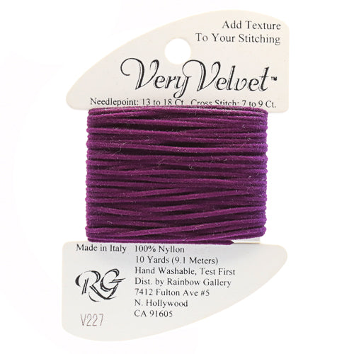 This is Very Velvet from Rainbow Gallery in color 227 Eggplant. A velvet thread perfect for stitching gloves, scarves, and other textures! Use as-is on 13 mesh