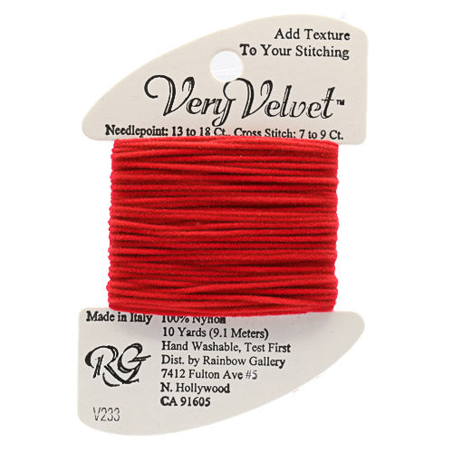 This is Very Velvet from Rainbow Gallery in color 233 Geranium. A velvet thread perfect for stitching gloves, scarves, and other textures! Use as-is on 13 mesh