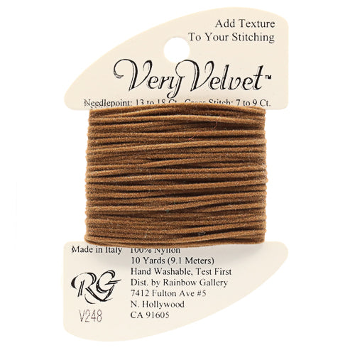 This is Very Velvet from Rainbow Gallery in color 248 Very Dark Fawn. A velvet thread perfect for stitching gloves, scarves, and other textures! Use as-is on 13 mesh