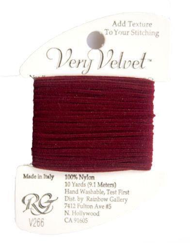 This is Very Velvet from Rainbow Gallery in color 255 Dark Red. A velvet thread perfect for stitching gloves, scarves, and other textures! Use as-is on 13 mesh