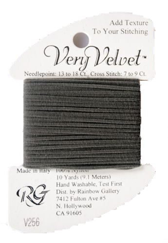 This is Very Velvet from Rainbow Gallery in color 256 Gray. A velvet thread perfect for stitching gloves, scarves, and other textures! Use as-is on 13 mesh