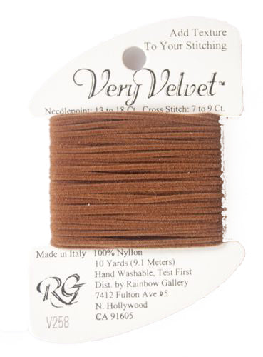 This is Very Velvet from Rainbow Gallery in color 258 Golden Brown. A velvet thread perfect for stitching gloves, scarves, and other textures! Use as-is on 13 mesh