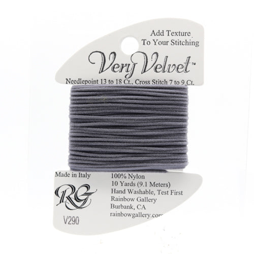 This is Very Velvet from Rainbow Gallery in color 290 Castlerock. A velvet thread perfect for stitching gloves, scarves, and other textures! Use as-is on 13 mesh