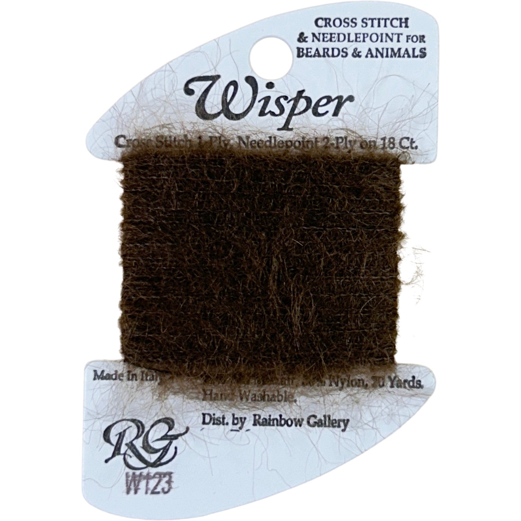 This is Wisper from Rainbow Gallery in color 123 Chestnut. Great for animals and beards! 4 ply on 13 mesh, 2 ply on 18 mesh.