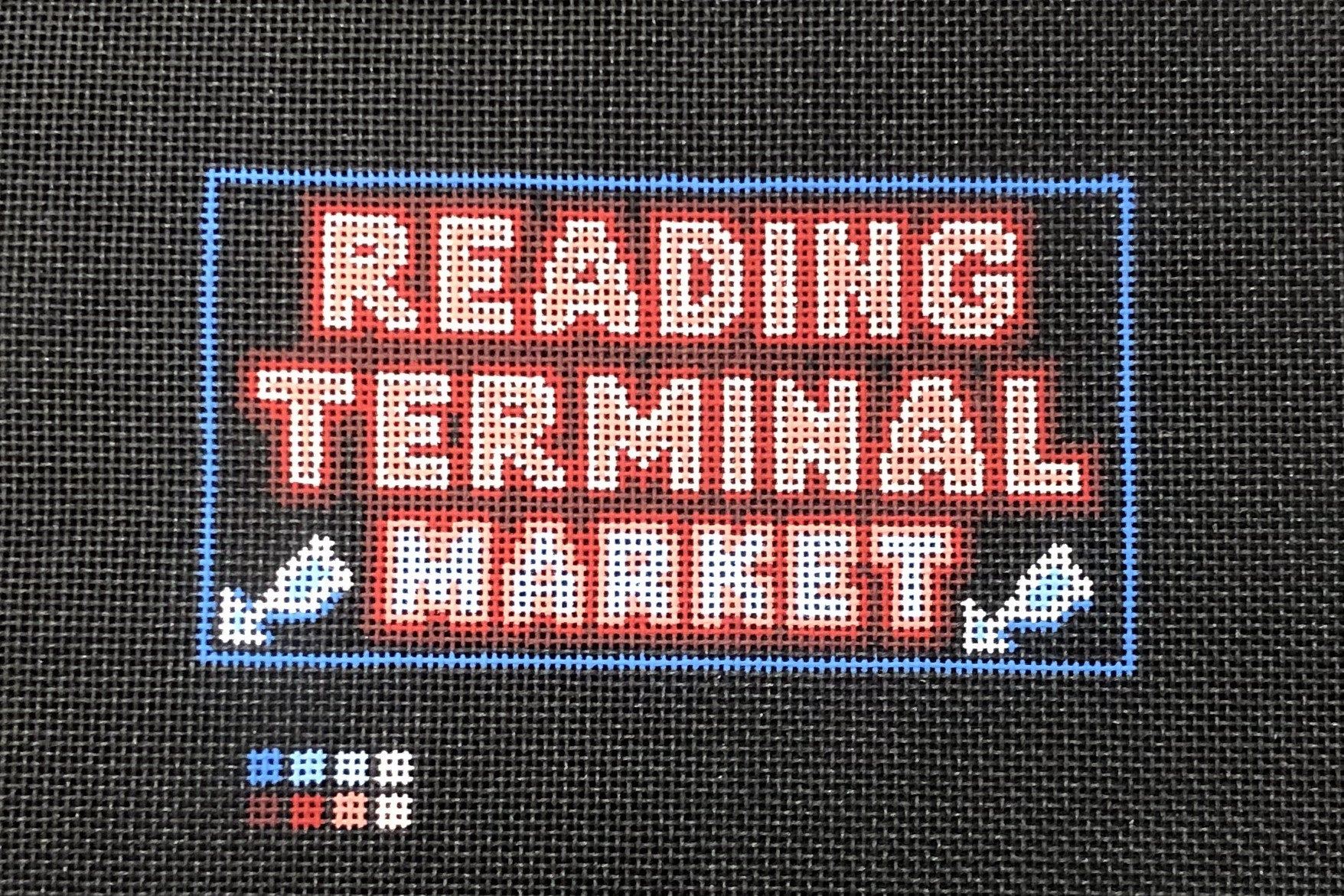 This hand painted needlepoint canvas by Rittenhouse Needlepoint features the Reading Terminal Market Neon Sign. It is painted on black mesh to enhance the look of the neon. Reading Terminal Market has been a Philadelphia staple since it's opening in 1893. Boasting over 80 merchants and serving 100,000 customers weekly, Rittenhouse Needlepoint is very proud to call the market our neighbor.