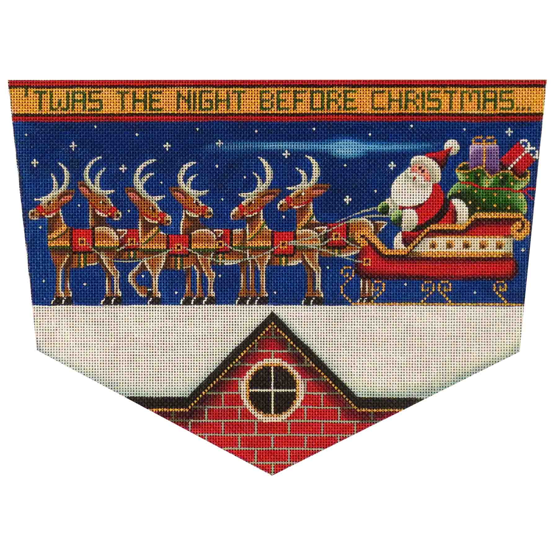 This hand painted stocking cuff needlepoint canvas by Rebecca Wood features Santa and his sleigh on a rooftop with "'Twas the night before Christmas" written across the top.