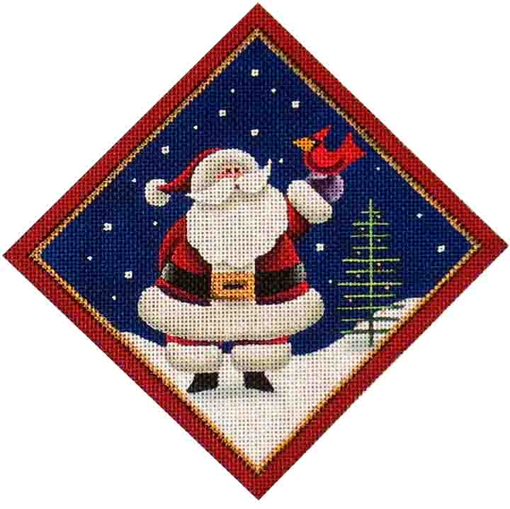 A beautiful hand painted needlepoint canvas from Rebecca Wood Designs featuring an adorable Santa with a cardinal sitting on his finger.