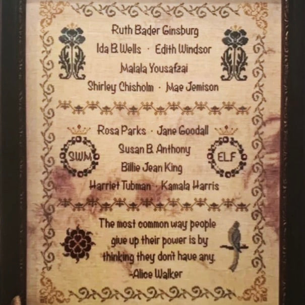 A counted cross stitch chart from Rebel Stitcher Designs. This sampler comes with full alphabet so the stitcher can customize their sampler to include the names of women who are important to them.