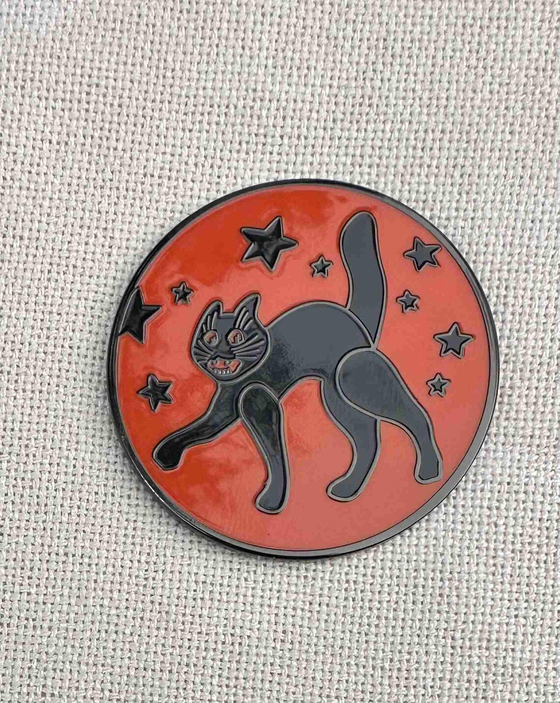 This enamel needle minder by Rebel Stitcher Designs features a black cat on a orange background.
