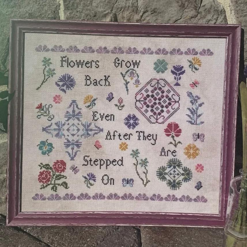 This printed cross stitch pattern by Rebel Stitcher features floral Quaker design with the quote "Flowers grow back even after they are stepped on." As stitched, it uses DMC and Cottage Garden Threads.