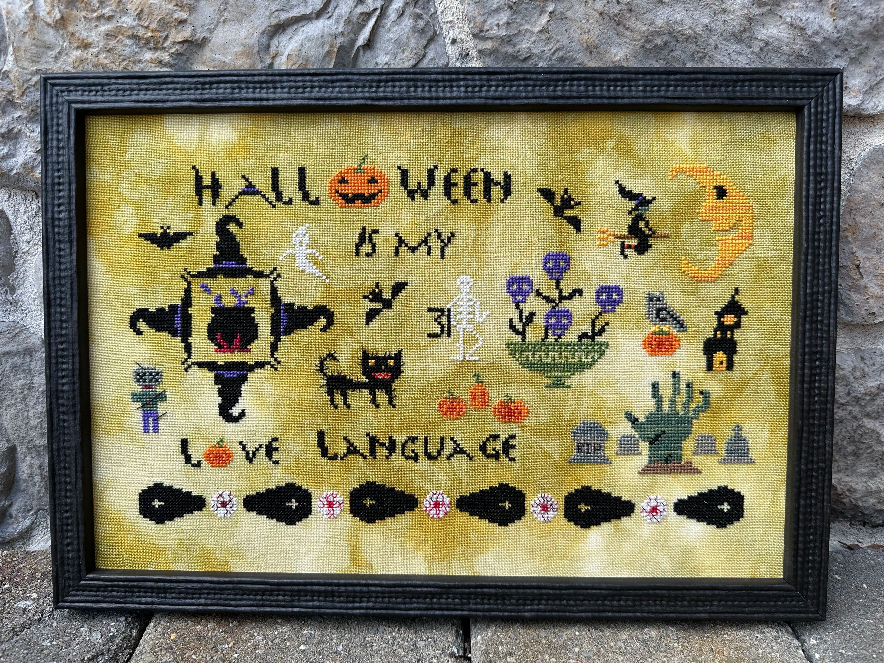 This printed cross stitch pattern by Rebel Stitcher features a Halloween sampler design with "Halloween is my love language". As stitched, it uses Classic Colorworks, Gentle Arts Sampler, and DMC floss.